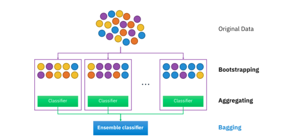 Bagging는 그 자체로 뜻이 있는 단어가 아닙니다. Bagging은 (Bootstrap aggregating) 의 약자 입니다. 즉, 부트스트랩들을 집계한다 라는 뜻으로 해석할 수 있습니다.