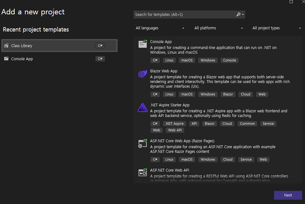 우선, Visual Studio를 켠 다음, Console App 을 선택하여 프로젝트를 만듭니다. ConsoleApp은 Class Library를 만든 후, 실행해보기 위한 용도입니다.