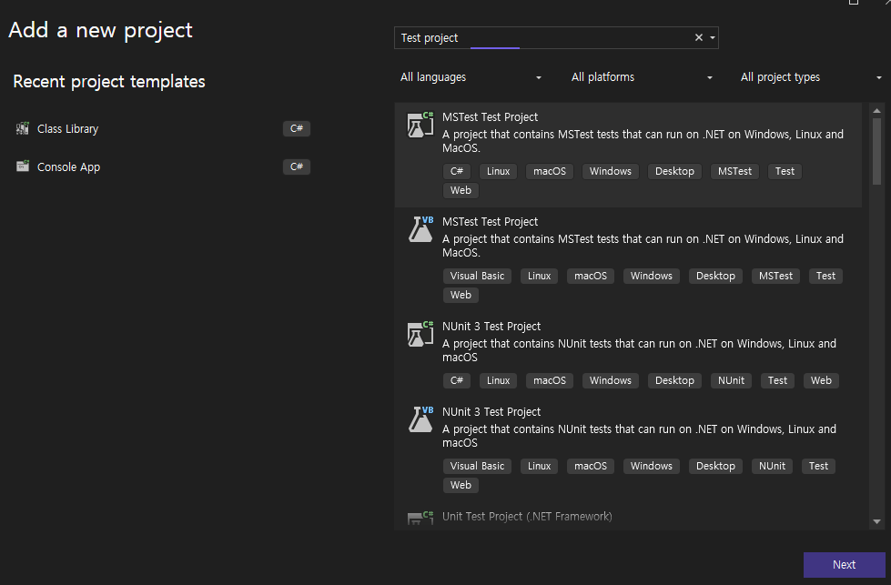 MSTest 프레임워크를 만드는 방법은 다음과 같습니다. Solution에 우클릭 - Add - NewProject를 하고, MsTest를 선택하여 만듭니다.