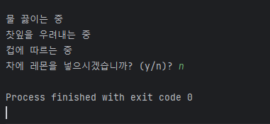 실행 후, 살펴보면, 아까와 다른점은 차에 레몬을 넣겠냐? 라는 사용자의 의사를 물어보고 있다는 점입니다.