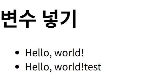 위 결과를 보면, text를 {}로 감싸서 변수 안에 담겨있는 값을 출력한것을 볼 수 있습니다. 또한, 문자열 변수에 리터럴 문자열을 더하면, 문자열 더하기가 되어있는 문자열이 랜더링 됩니다.