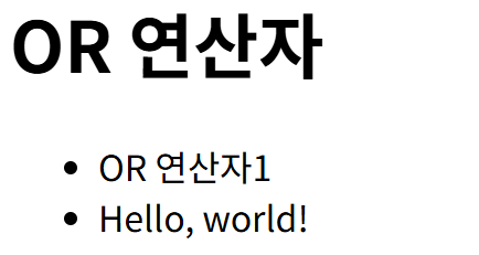 결과를 보면, 처음 식에서 1+1 !== 2는 거짓이기 때문에, 뒤에 있는 문자열 OR 연산자1이 랜더링 된 것을 알 수 있습니다. 두번째 아이템을 보면, text는 항상 참인 값이기 때문에 text 변수 안에 담겨있는 값인 Hello, World!가 출력되는것을 볼 수 있습니다.
