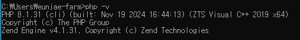 여기까지 하고 cmd를 다시 켜서 php -v 를 입력하면 버전정보가 나타납니다.